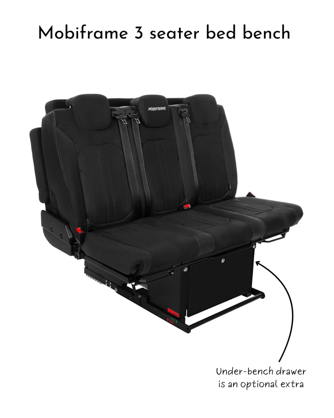 Mobiframe Bed Bench on Rails – 3 Seater with Seat Belts