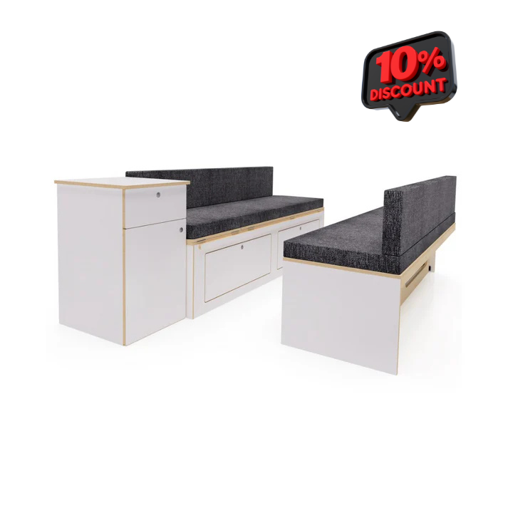 Consists of a twin bench set up for maximum seating area and folds down to create a large full size bed covering 1800mm x 1600mm in size.